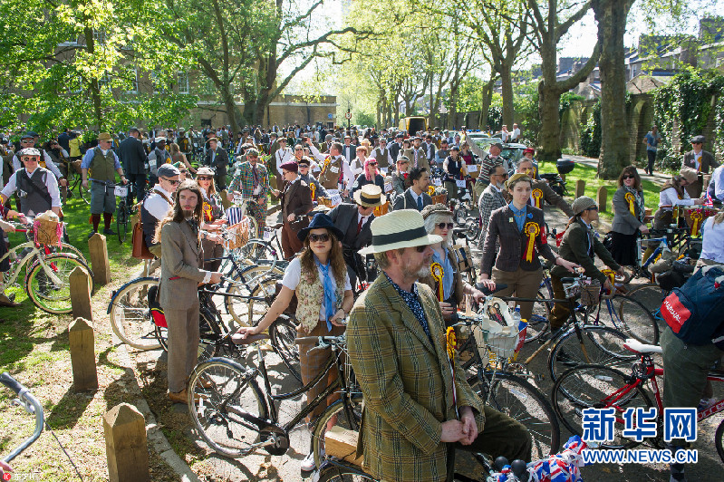 當地時間2018年5月5日,英國倫敦,當地舉辦復古騎行活動,民眾身穿花呢子服裝騎車穿行在倫敦街頭。今年是該活動舉辦十周年。(圖片來源:東方IC)