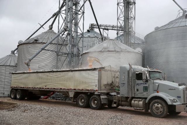 3月27日,在美國艾奧瓦州得梅因的金伯利農場,卡車從糧倉裝載糧食。(新華社記者汪平攝)
