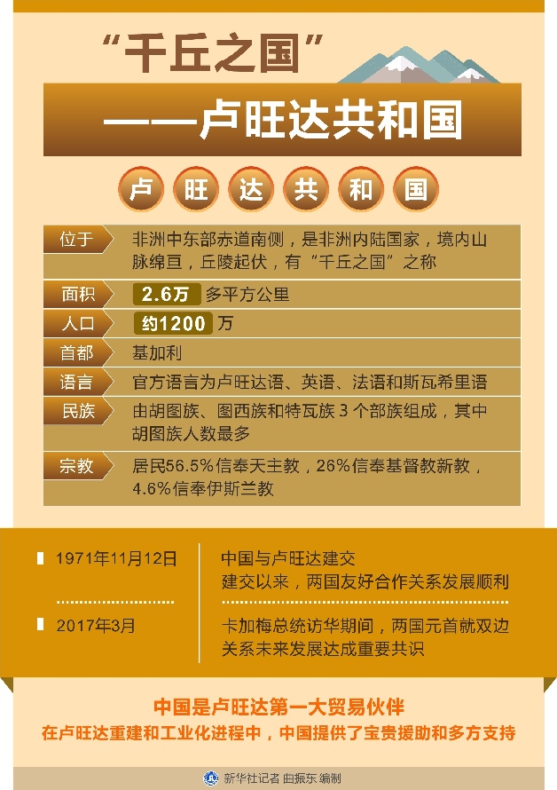 盧旺達(dá)位于非洲中東部赤道南側(cè),是非洲內(nèi)陸國家。境內(nèi)山脈綿亙,丘陵起伏,有“千丘之國”之稱。