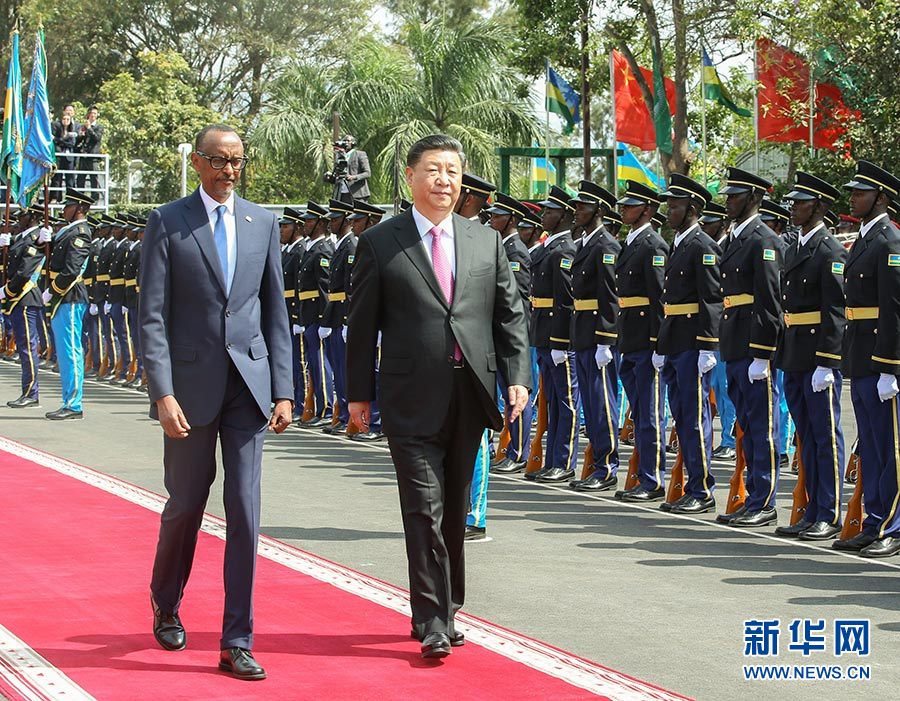 習近平和夫人彭麗媛抵達總統府時,卡加梅和夫人珍妮特上前迎接。兩國元首登上檢閱臺。軍樂隊奏中盧兩國國歌。在卡加梅陪同下,習近平檢閱儀仗隊。習近平和彭麗媛同盧方主要官員握手??用贩驄D同中方陪同人員握手。身著民族服裝的當地民眾,通過別具特色的盧旺達舞蹈和鼓樂表演,抒發對習近平到訪的激動和喜悅。