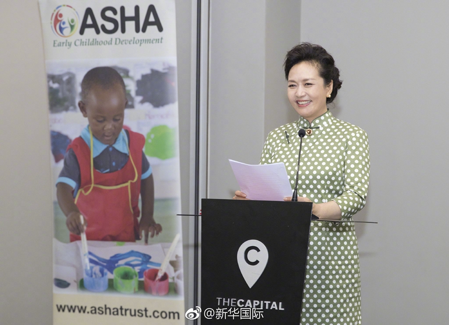 彭麗媛在南非總統夫人莫采佩陪同下抵達典禮會場,非洲自助基金會負責人在門口迎接。當彭麗媛走進會場時,幼教教師齊聲演唱南非民族歌曲,跳起輕快的舞蹈,以當地特有的熱情親密方式表達對中國貴賓的歡迎。落座后,基金會負責人和莫采佩先后致歡迎辭。隨后,彭麗媛走上講臺致辭。彭麗媛表示,教師是一項崇高職業。為師者只有牢記國家和民族期待和重托,以德施教、以德立身,始終懷著一顆仁愛之心,始終不懈學習、刻苦鉆研,才能更好幫助學生們成長成才,實現夢想,成為國家振興和民族富強事業的接班人。希望在座教師和同學們積極投身中南友好合作事業,為中南關系發展貢獻力量。