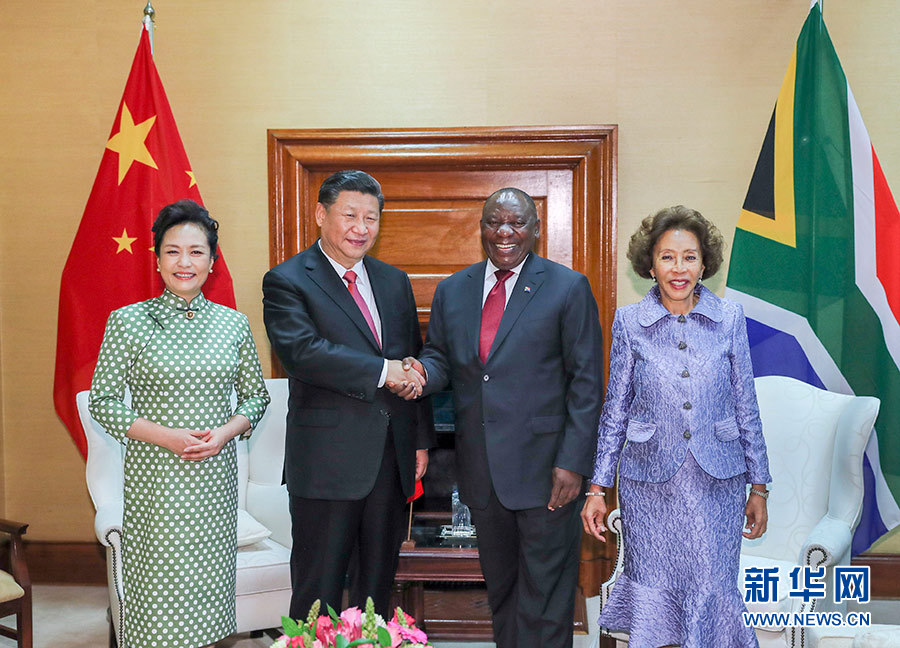 7月24日,國(guó)家主席習(xí)近平在比勒陀利亞同南非總統(tǒng)拉馬福薩舉行會(huì)談。這是會(huì)談前,習(xí)近平和夫人彭麗媛同拉馬福薩和夫人莫采佩合影。新華社記者謝環(huán)馳攝