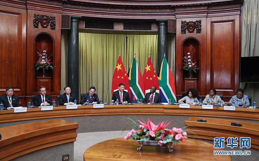 習(xí)主席對(duì)南非進(jìn)行國(guó)事訪問期間,兩國(guó)元首就推進(jìn)新時(shí)期中南全面戰(zhàn)略伙伴關(guān)系達(dá)成重要共識(shí),一致同意加強(qiáng)高層往來(lái),深化政治互信,對(duì)接發(fā)展戰(zhàn)略,推進(jìn)務(wù)實(shí)合作,密切人文交流,讓兩國(guó)人民更多享受中南合作成果。