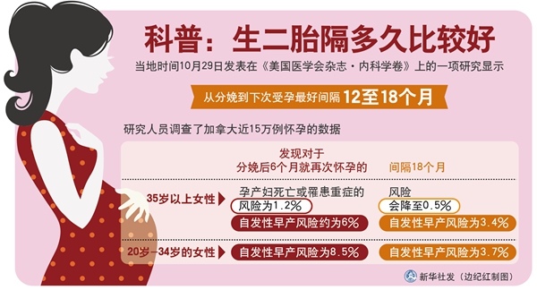 新華社華盛頓10月29日電(記者周舟)生二胎隔多久比較好?29日發表在《美國醫學會雜志·內科學卷》上的一項研究顯示,從分娩到下次受孕最好間隔12至18個月。