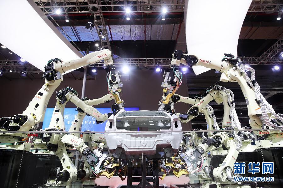 11月6日,日本那智不二越公司展出的點焊密集協作機器人在進行作業演示。 11月5日至10日,首屆中國國際進口博覽會在上海國家會展中心舉行。 新華社記者 丁汀 攝