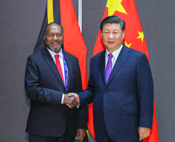 11月16日,國家主席習近平在莫爾茲比港分別會見建交太平洋島國領導人。這是習近平會見庫克群島總理普納。新華社記者 丁林 攝