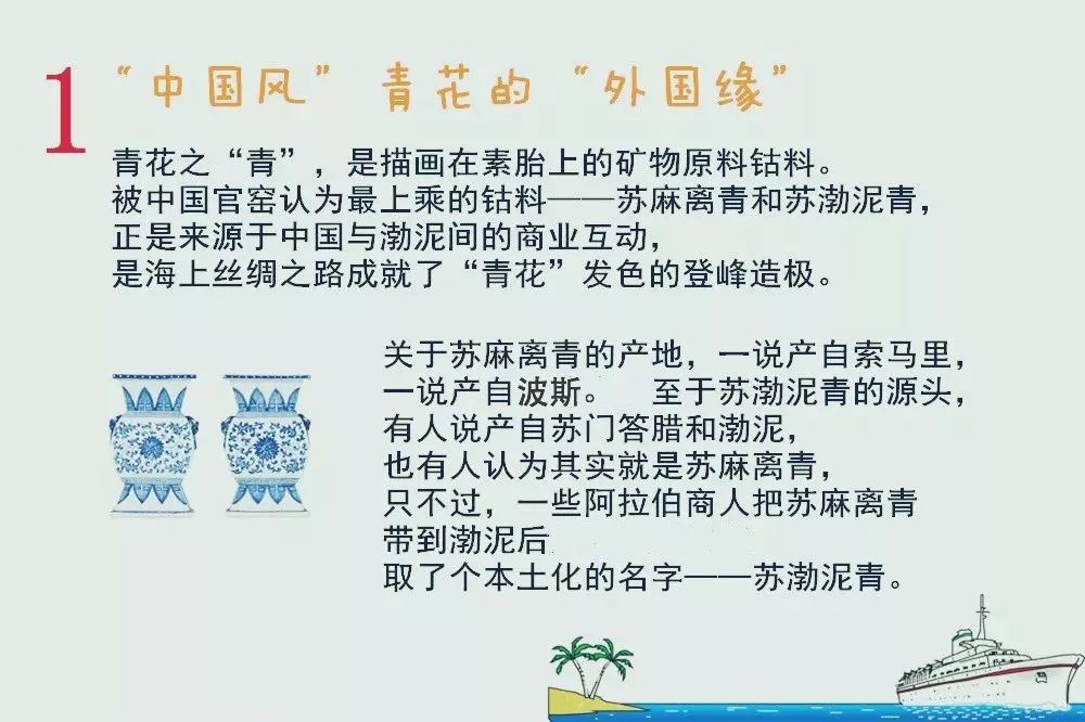 然而,很少有人知道,青花雖是“中國風”,但卻有段“外國緣”。青花之“青”,是描畫在素胎上的礦物原料鈷料。被中國官窯認為最上乘的鈷料——蘇麻離青和蘇渤泥青,正是來源于中國與渤泥間的商業互動,是海上絲綢之路成就了“青花”發色的登峰造極。