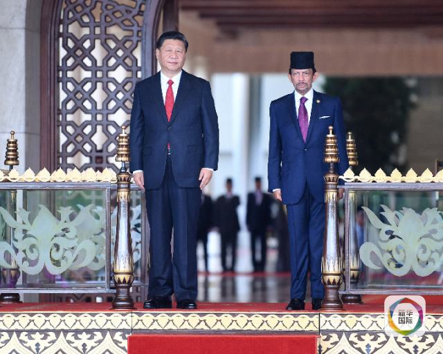 11月19日,國家主席習近平在斯里巴加灣同文萊蘇丹哈桑納爾舉行會談。會談開始前,習近平出席哈桑納爾在王宮前廣場舉行的盛大歡迎儀式。這是在哈桑納爾陪同下,習近平檢閱儀仗隊。新華社記者 鞠鵬 攝