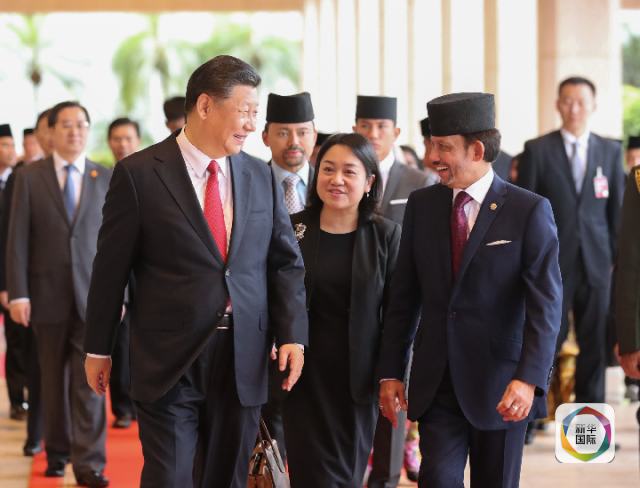 11月19日,國家主席習近平在斯里巴加灣同文萊蘇丹哈桑納爾舉行會談。這是習近平同哈桑納爾親切交談。新華社記者 鞠鵬 攝
