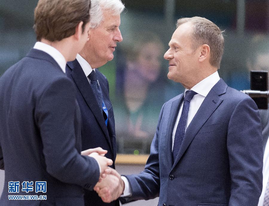 11月25日,在比利時(shí)布魯塞爾的歐盟特別峰會(huì)會(huì)場,歐洲理事會(huì)主席圖斯克(右)與歐盟“脫歐”談判首席代表米歇爾·巴尼耶(中)握手。 新華社記者葉平凡攝