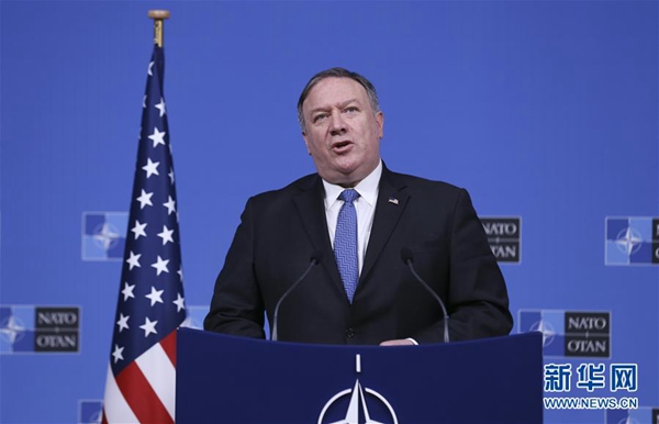 12月4日,在比利時布魯塞爾,美國國務卿蓬佩奧出席新聞發布會。 新華社記者 葉平凡 攝