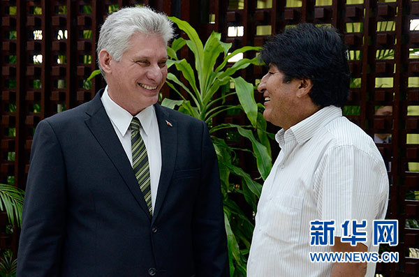 12月14日,在古巴哈瓦那,古巴國務委員會主席兼部長會議主席迪亞斯-卡內爾(左)在峰會開幕前和玻利維亞總統莫拉萊斯交談。 新華社發(華金·埃爾南德斯 攝)