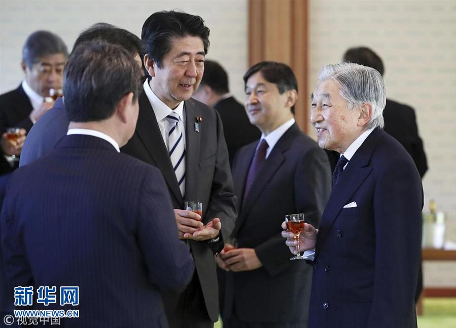 當(dāng)?shù)貢r間2018年12月17日,日本東京,日本明仁天皇在皇宮與日本首相安倍晉三領(lǐng)導(dǎo)的政府高官共進(jìn)年終午餐。(圖片來源:視覺中國)