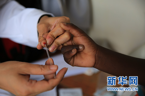 這張2018年12月8日拍攝的照片顯示,在馬拉維南部布蘭太爾市卡迪迪村衛生院,第六批中國援馬拉維醫療隊醫生在義診活動中為當地居民檢測瘧疾。新華社發(樊江波 攝)