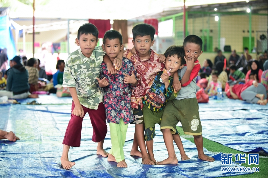 12月25日,幾名男孩在印度尼西亞萬丹省板底蘭縣的災民安置點玩耍。新華社記者杜宇攝