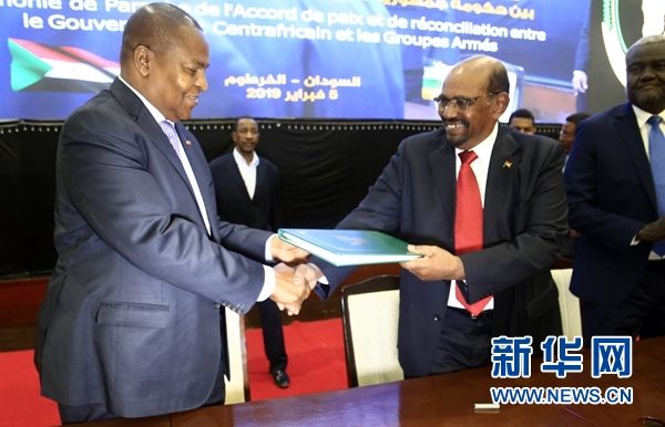 2月5日,在蘇丹首都喀土穆,蘇丹總統(tǒng)巴希爾(右)將和平協(xié)議文件交給中非共和國(guó)總統(tǒng)圖瓦德拉。新華社發(fā)(穆罕默德·海德爾攝)