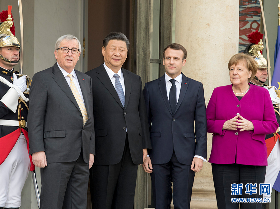 3月26日,國家主席習近平在巴黎同出席中法全球治理論壇閉幕式的法國總統馬克龍、德國總理默克爾和歐盟委員會主席容克舉行會晤。 新華社記者 高潔 攝