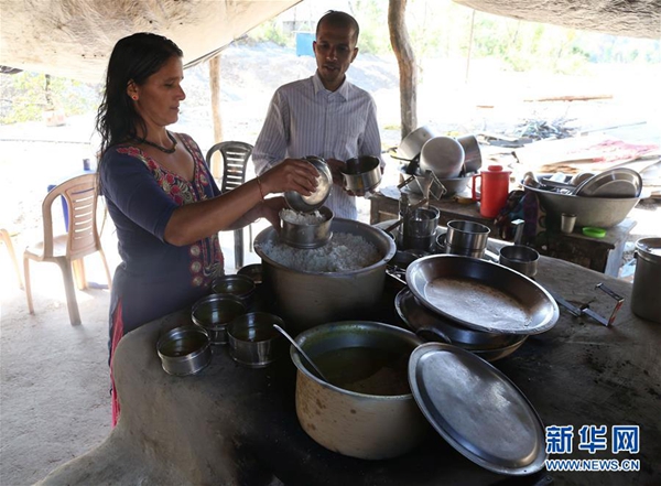 用餐高峰時期,占茜每頓要做20多份飯菜。阿查亞上夜班居多,每天早上下班后,他就給妻子打下手,幫她張羅飯菜。