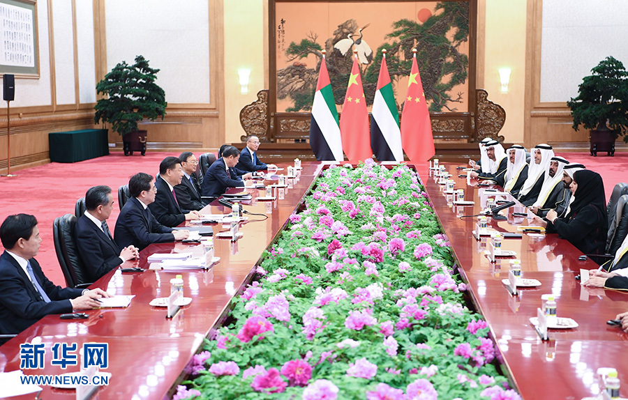 習(xí)近平指出,去年7月我訪問(wèn)阿聯(lián)酋期間,兩國(guó)宣布建立全面戰(zhàn)略伙伴關(guān)系,揭開中阿關(guān)系發(fā)展新篇章。中方視阿聯(lián)酋為共建“一帶一路”的重要合作伙伴。雙方要穩(wěn)步推進(jìn)以能源合作為主軸、以投資和基礎(chǔ)設(shè)施建設(shè)為兩翼、以高新技術(shù)為增長(zhǎng)點(diǎn)的務(wù)實(shí)合作。下階段要對(duì)接創(chuàng)新發(fā)展戰(zhàn)略,打造兩國(guó)合作新增長(zhǎng)點(diǎn)。要深化打擊恐怖主義和極端勢(shì)力等安全領(lǐng)域合作,共同維護(hù)兩國(guó)和地區(qū)安全穩(wěn)定。副總統(tǒng)先生提出的“擁抱中國(guó)”計(jì)劃深受阿聯(lián)酋民眾歡迎,要不懈推動(dòng)兩國(guó)人文交流。中方支持阿方明年舉辦中東地區(qū)首屆世博會(huì)。