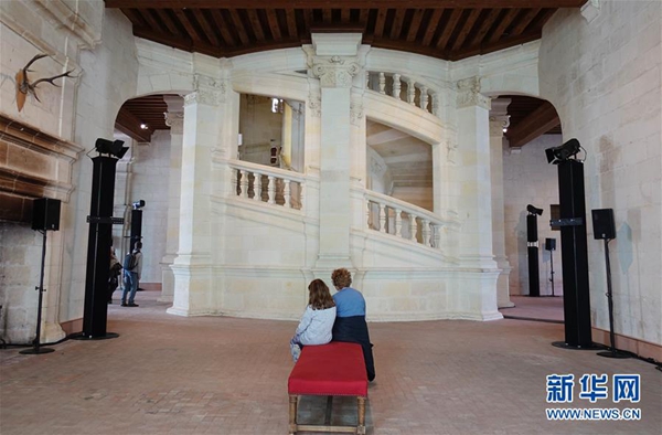 5月1日,游客在法國盧瓦爾河谷地區(qū)的香波堡參觀據(jù)稱來自達·芬奇構(gòu)思的雙螺旋樓梯。 新華社記者 高靜 攝