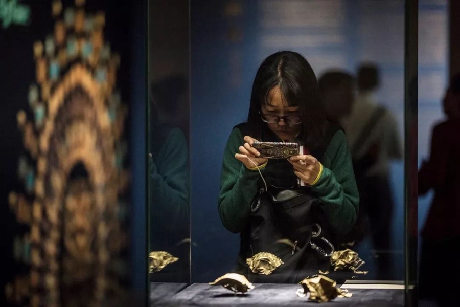 一名觀眾在清華大學藝術博物館欣賞來自阿富汗的文物。(圖片來自清華大學藝術博物館官微)