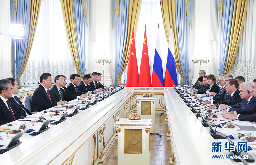 習近平強調,雙方要再接再厲,推動各領域合作持續深入發展,給兩國人民帶來更多實惠,為兩國發展復興注入更強大動力。雙方還要加強在聯合國、世界貿易組織、金磚國家、二十國集團等多邊事務中的合作,為國際社會貢獻更多“中俄方案”。
