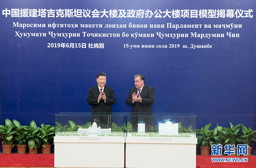 6月15日,國家主席習近平在杜尚別同塔吉克斯坦總統拉赫蒙會談。會談后,兩國元首共同出席中方援塔議會大樓、政府辦公大樓項目模型揭幕儀式。 新華社記者 王曄 攝