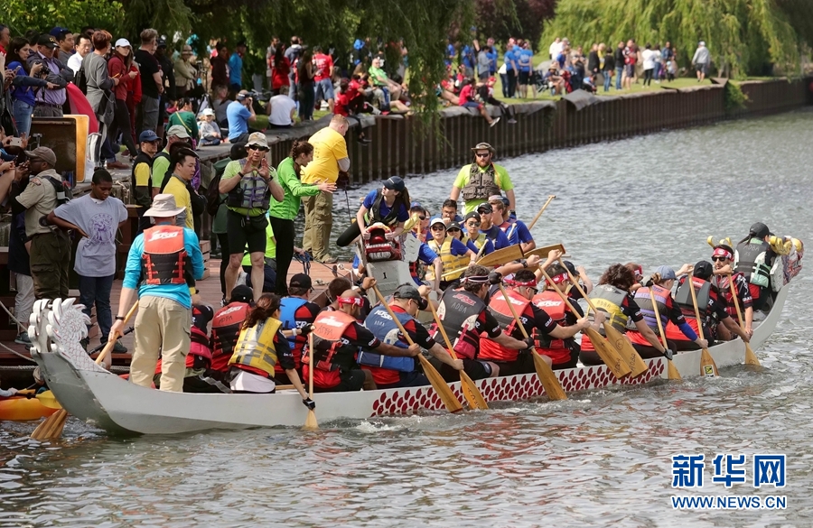 6月22日,由芝加哥華商會(huì)舉辦的第19屆芝加哥龍舟賽在中國城譚繼平公園舉行,這是參賽的隊(duì)員在比賽。記者 汪平 攝