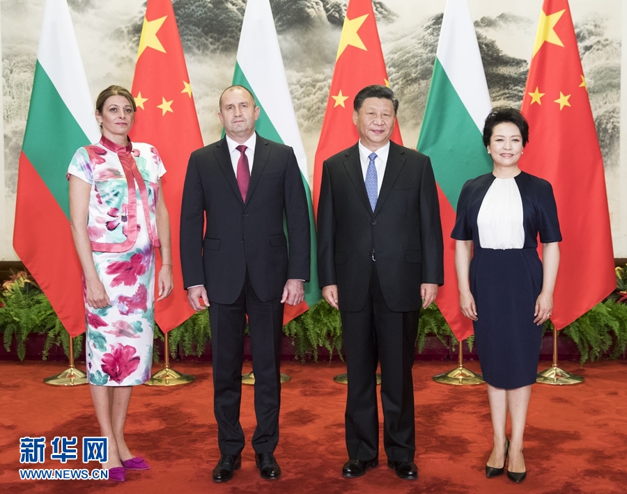 7月3日,國家主席習近平在北京人民大會堂同保加利亞總統拉德夫舉行會談。這是習近平和夫人彭麗媛同拉德夫夫婦合影。 新華社記者 黃敬文 攝