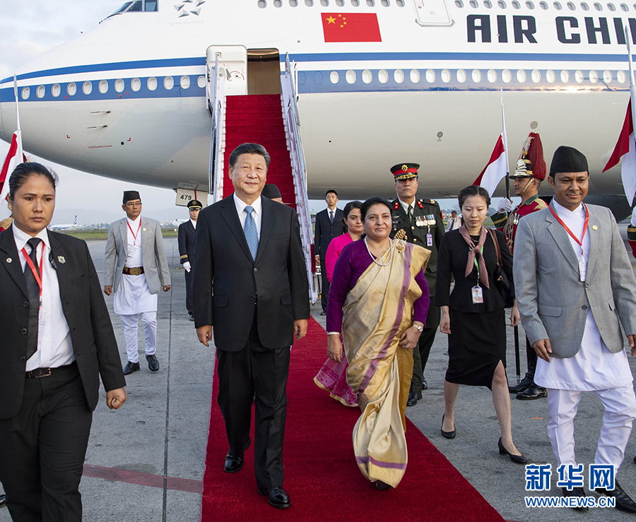 10月12日,國家主席習(xí)近平乘專機抵達(dá)加德滿都,開始對尼泊爾進行國事訪問。習(xí)近平步出艙門,尼泊爾總統(tǒng)班達(dá)里偕女兒烏莎在舷梯旁熱情迎接。 新華社記者 李濤 攝