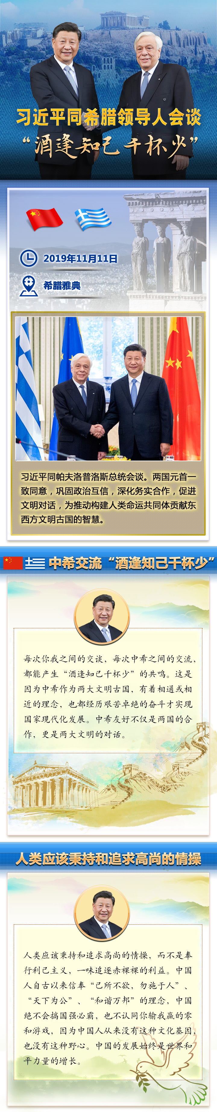 新華社雅典11月12日電 國家主席習近平11月10日晚抵達雅典,開始對希臘進行國事訪問。11日上午,習主席的訪問活動異常密集:向希臘無名戰士紀念碑獻花圈,出席希臘總統帕夫洛普洛斯舉行的隆重歡迎儀式并同帕夫洛普洛斯舉行會談,旋即又同總理米佐塔基斯舉行會談、出席合作文本交換儀式、共同會見記者。中希兩國領導人就雙邊關系及共同關心的國際和地區問題深入交換意見,達成廣泛共識。