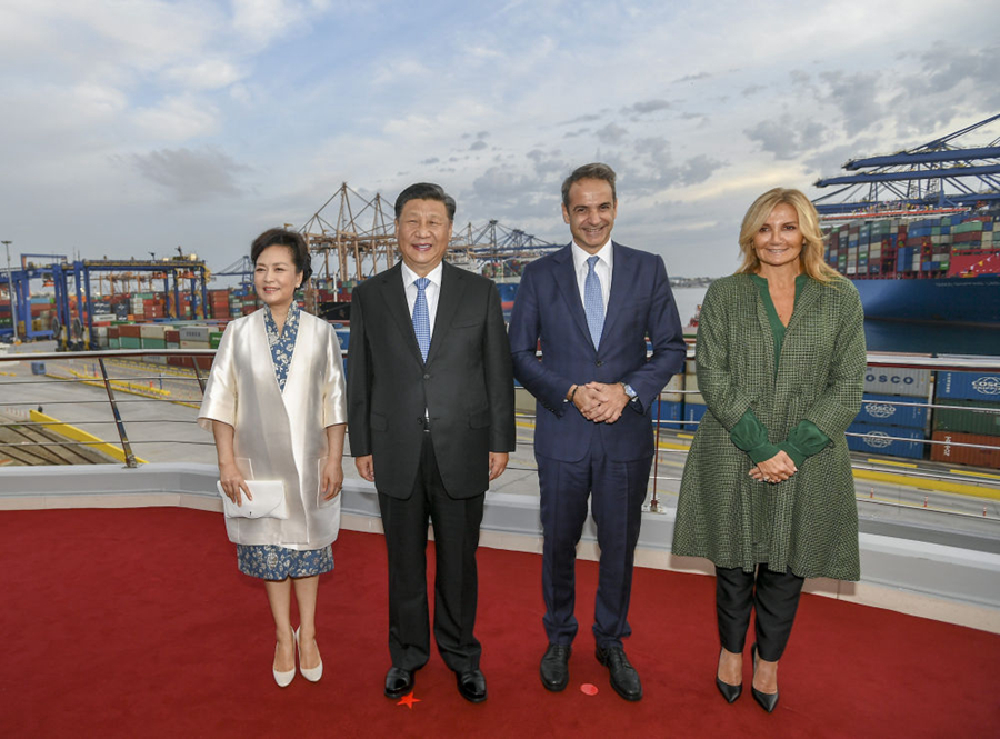 這是習近平和夫人彭麗媛同米佐塔基斯夫婦在港口樓頂平臺合影。新華社記者謝環(huán)馳攝