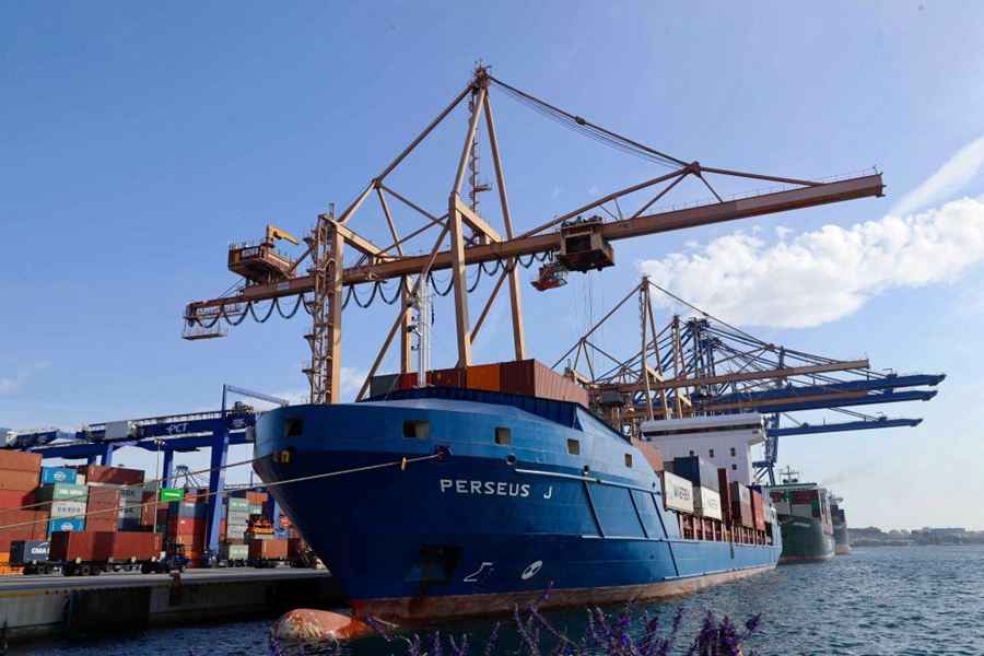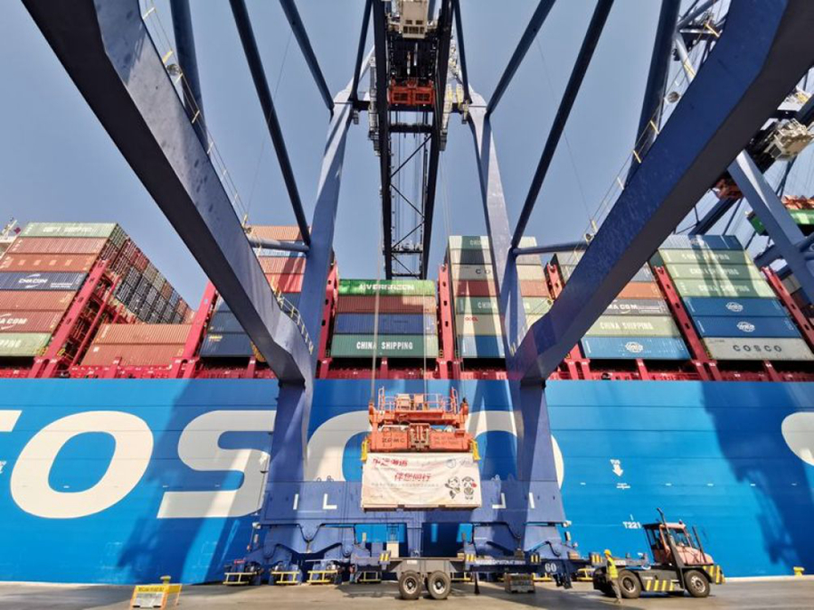 9月6日,在希臘比雷埃夫斯港,裝有進博會參展貨物的冷箱正在裝船。新華社記者李曉鵬攝