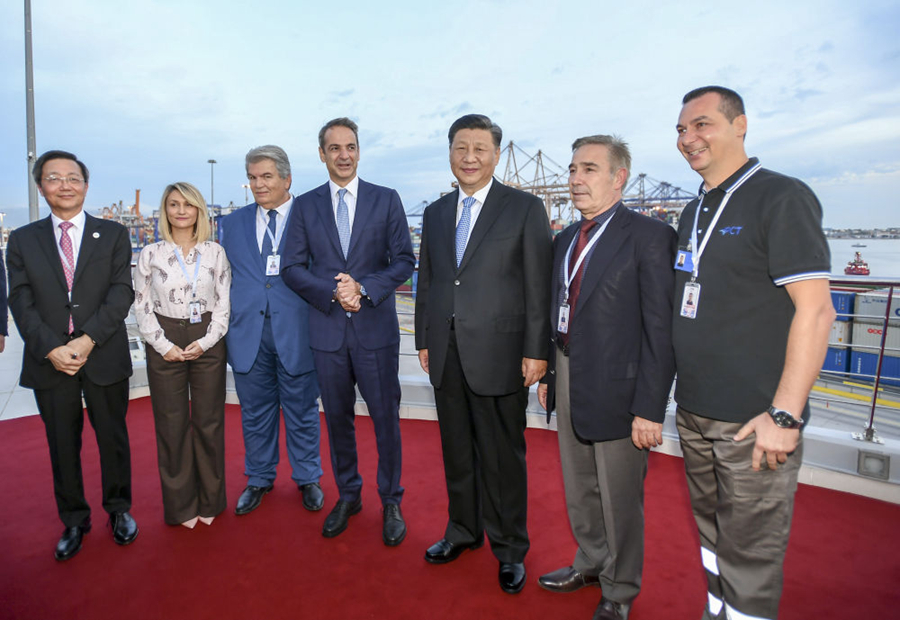 這是習近平夫婦和米佐塔基斯夫婦同中遠當?shù)貑T工等合影。新華社記者黃敬文攝