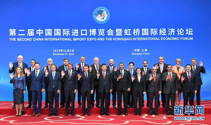 11月5日,第二屆中國國際進口博覽會在上海國家會展中心開幕。國家主席習(xí)近平出席開幕式并發(fā)表題為《開放合作 命運與共》的主旨演講。這是開幕式前,習(xí)近平同外方領(lǐng)導(dǎo)人集體合影。新華社記者謝環(huán)馳攝