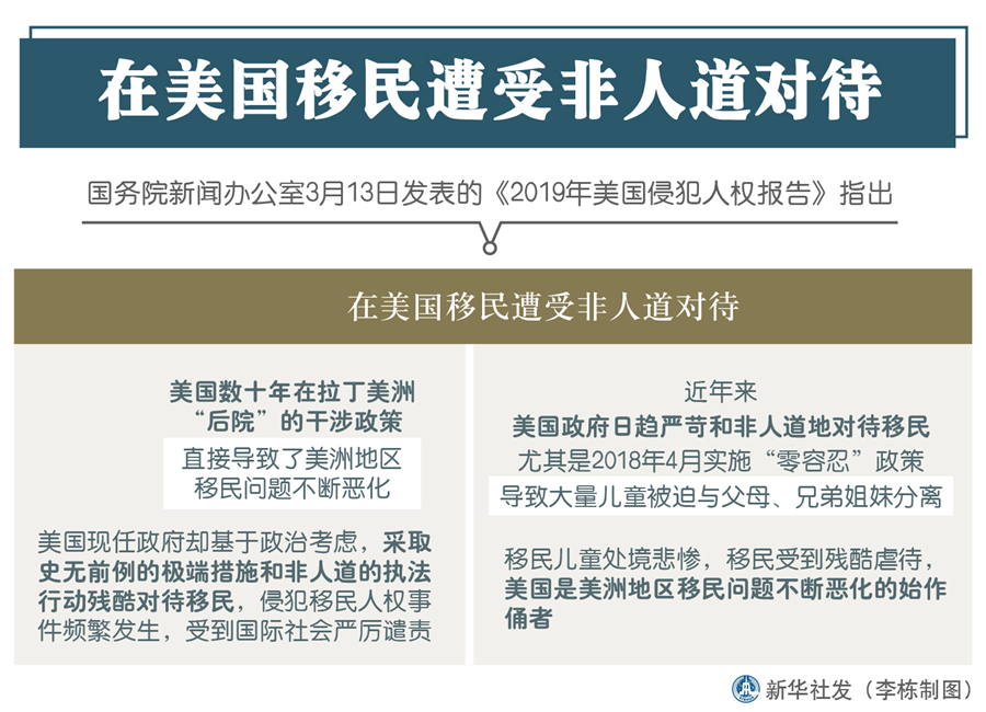 新華社北京3月13日電(記者王鵬、李超)國務院新聞辦13日發表的《2019年美國侵犯人權報告》指出,在美國移民遭受非人道對待。