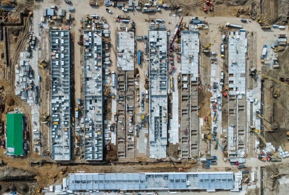 這是3月27日在俄羅斯首都莫斯科市郊拍攝的方艙醫(yī)院施工現場。新華社/衛(wèi)星社