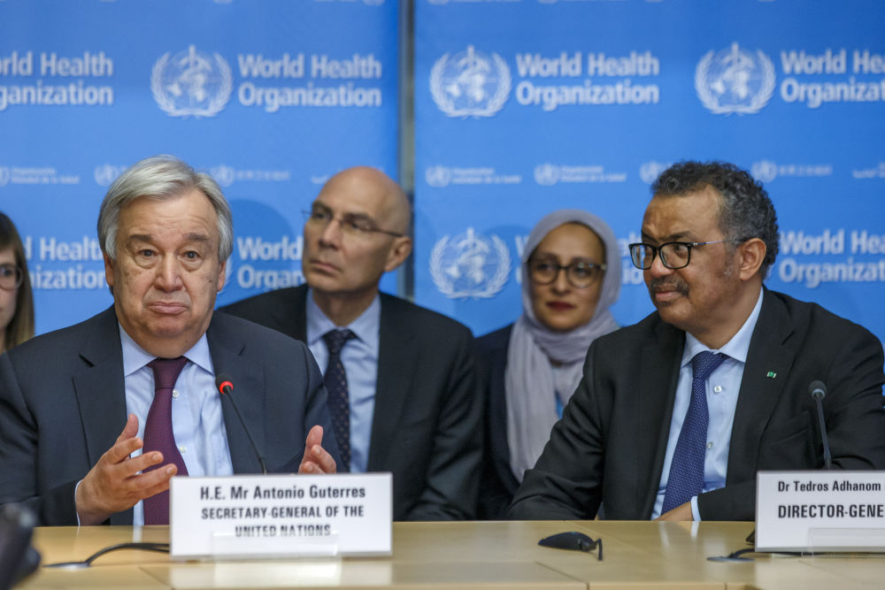 2月24日,在瑞士日內瓦,聯合國秘書長古特雷斯(左)在世界衛(wèi)生組織總部發(fā)表講話。新華社發(fā)