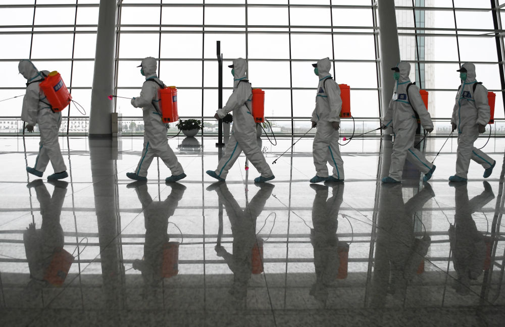 4月3日,在武漢天河機場,消防隊員進入航站樓進行消殺作業(yè)。新華社記者 程敏 攝