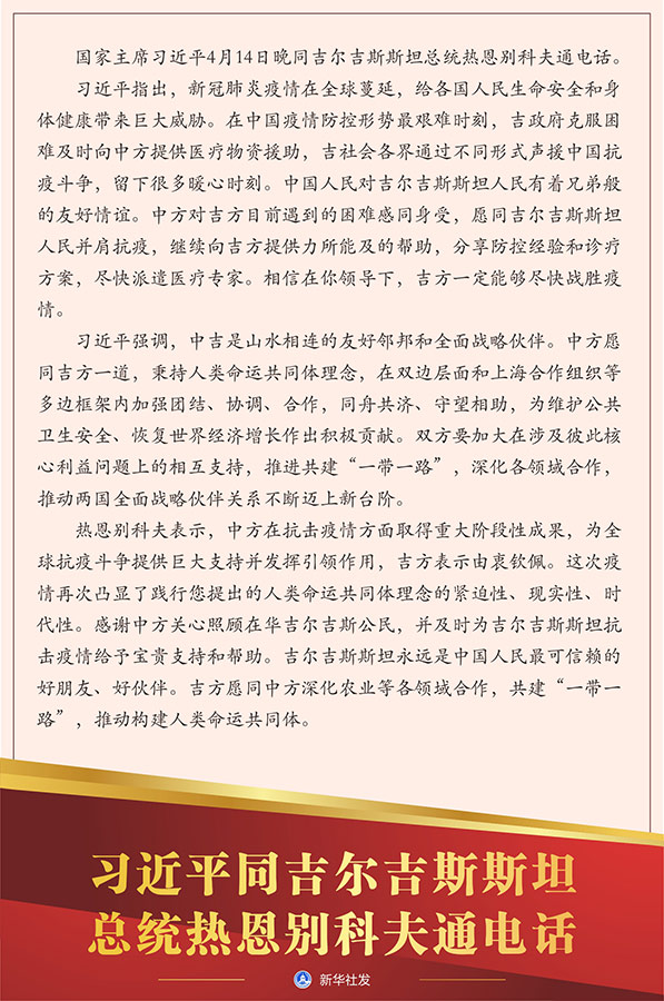 習近平指出,新冠肺炎疫情在全球蔓延,給各國人民生命安全和身體健康帶來巨大威脅。在中國疫情防控形勢最艱難時刻,吉政府克服困難及時向中方提供醫(yī)療物資援助,吉社會各界通過不同形式聲援中國抗疫斗爭,留下很多暖心時刻。中國人民對吉爾吉斯斯坦人民有著兄弟般的友好情誼。中方對吉方目前遇到的困難感同身受,愿同吉爾吉斯斯坦人民并肩抗疫,繼續(xù)向吉方提供力所能及的幫助,分享防控經(jīng)驗和診療方案,盡快派遣醫(yī)療專家。相信在你領導下,吉方一定能夠盡快戰(zhàn)勝疫情。