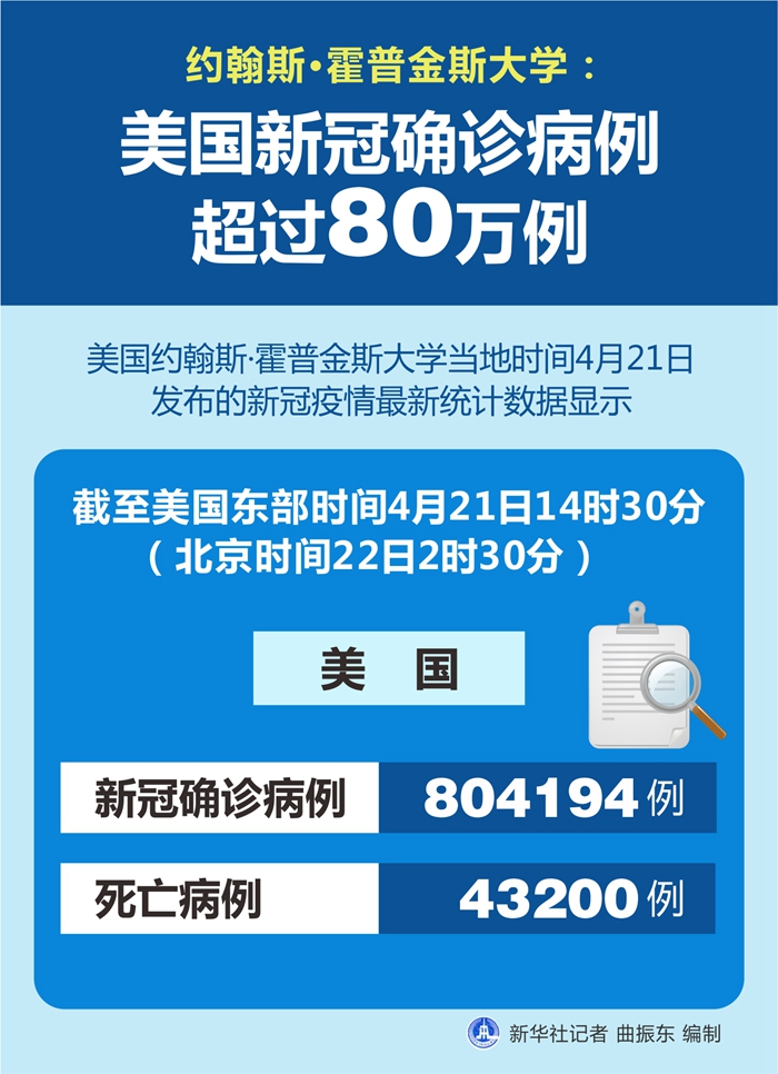 新華社紐約4月21日電? 美國約翰斯·霍普金斯大學21日發布的新冠疫情最新統計數據顯示,截至美國東部時間21日14時30分(北京時間22日2時30分),美國新冠確診病例升至804194例,死亡病例為43200例。