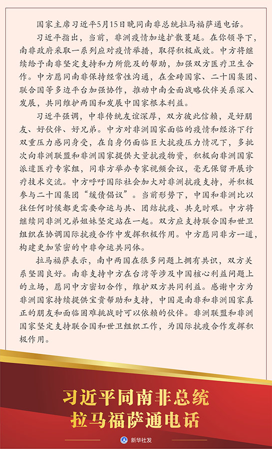 新華社北京5月15日電 國家主席習近平5月15日晚同南非總統拉馬福薩通電話。