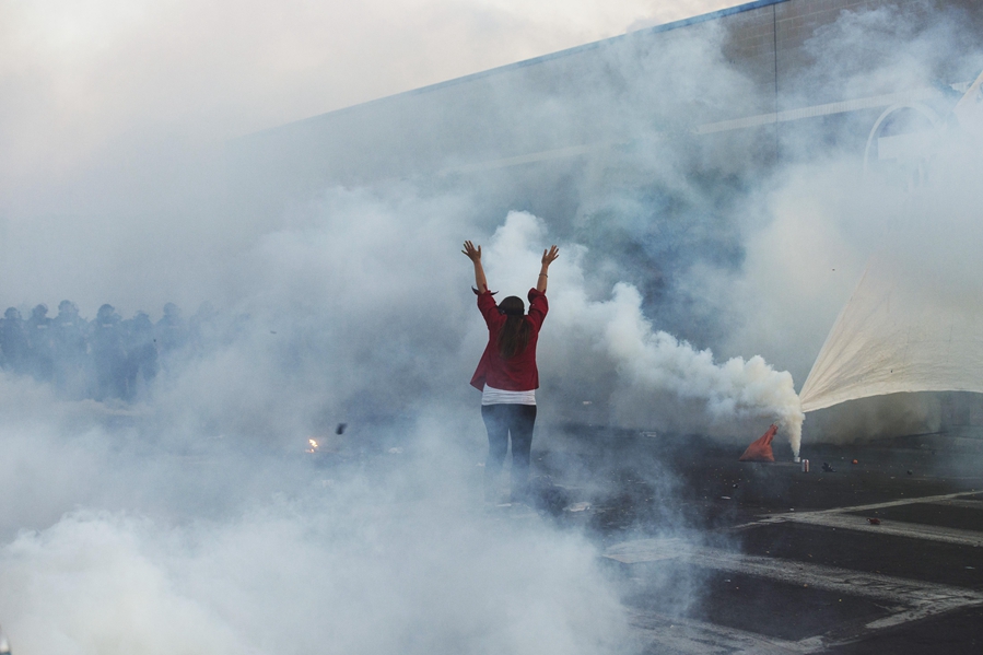 5月30日晚,在美國明尼蘇達州明尼阿波利斯市,抗議者在防暴警察施放的催淚瓦斯中與警察對峙。新華社發(安格斯·亞歷山大攝)