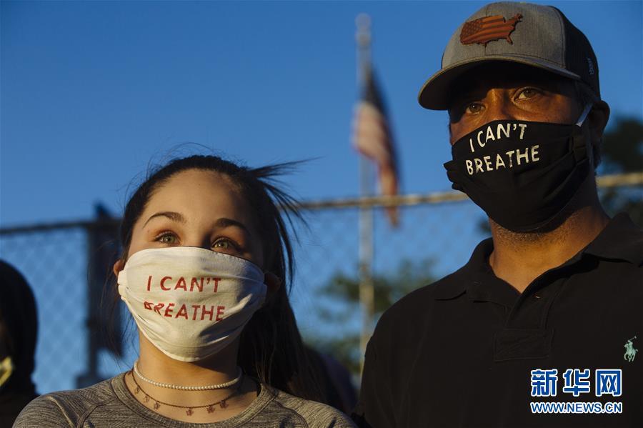 5月30日晚,在美國明尼蘇達州明尼阿波利斯市,抗議者面戴寫有“我無法呼吸”的口罩,參加抗議活動。新華社發(安格斯·亞歷山大攝)
