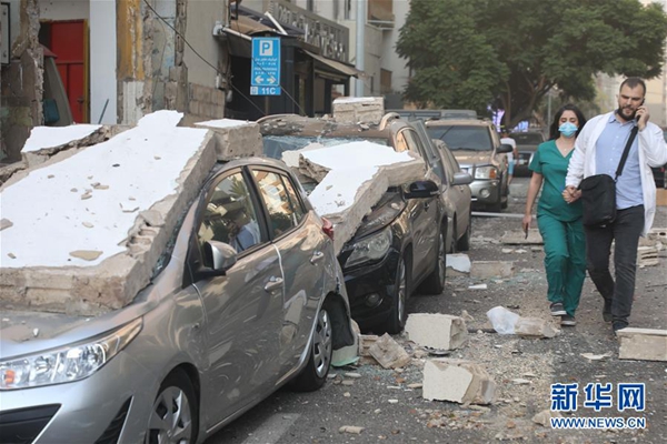 8月4日,在黎巴嫩首都貝魯特,人們從爆炸中受損的車輛旁走過。 新華社發(比拉爾·賈維希 攝)