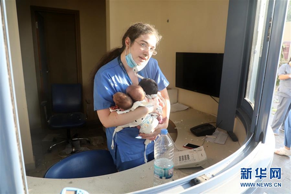8月4日,在黎巴嫩首都貝魯特,一名護士在受損的醫院內照料三名嬰兒。新華社發(比拉爾·賈維希攝)