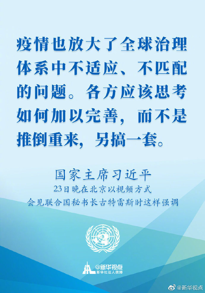 國家主席習近平23日晚在北京以視頻方式會見聯合國秘書長古特雷斯時講話的金句