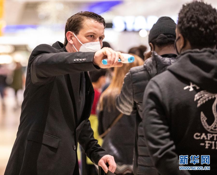 11月27日,在美國伊利諾伊州羅斯芒特,一名店員為等待進店的顧客測體溫。