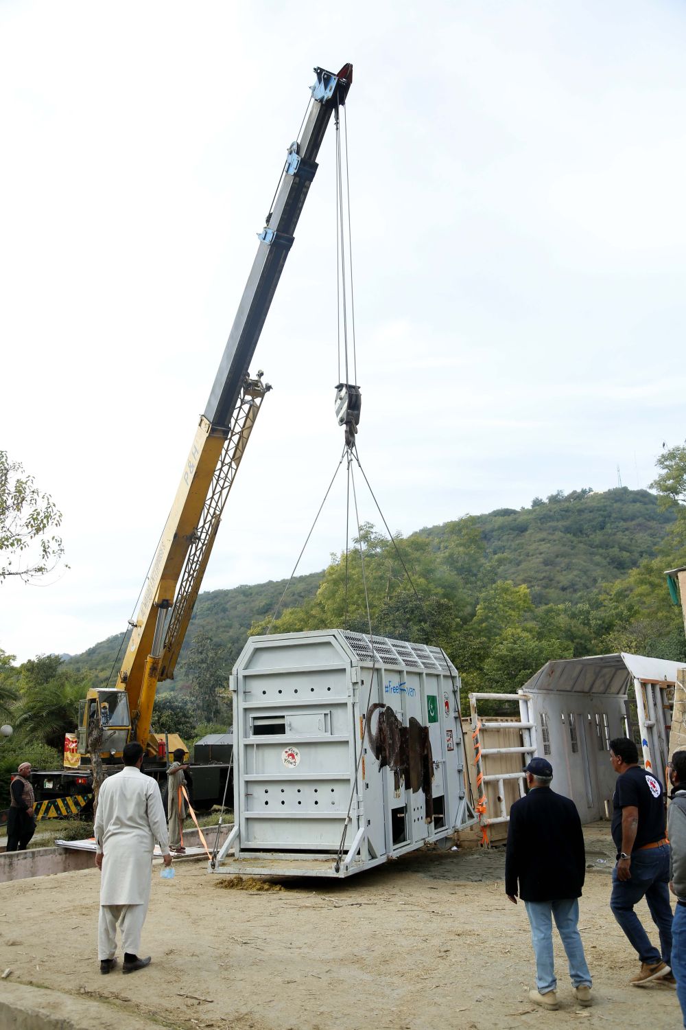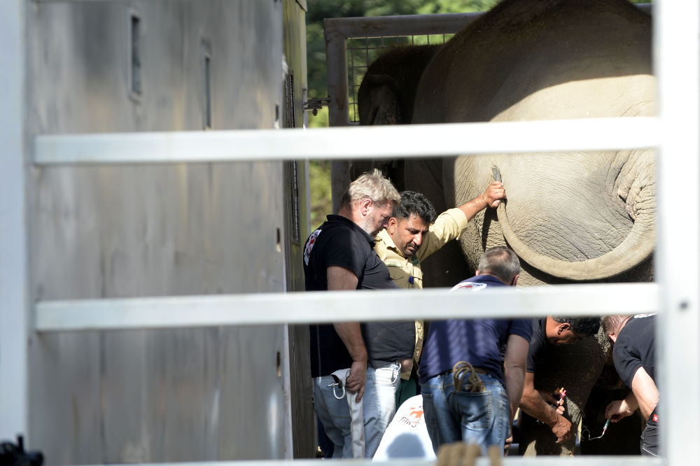 ↑11月29日,在巴基斯坦伊斯蘭堡,工作人員為運輸大象做準(zhǔn)備