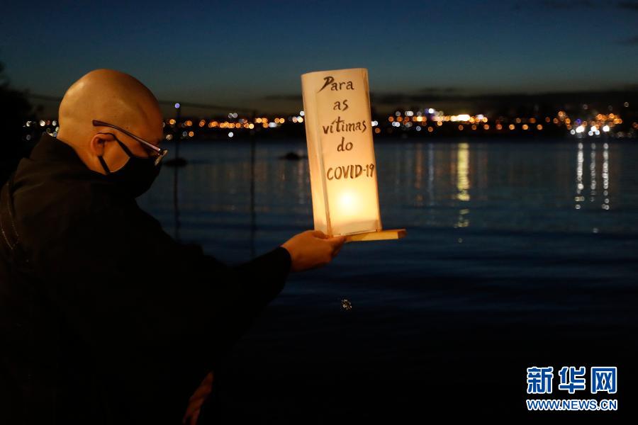 11月30日,在巴西首都巴西利亞,一名男子往湖中放入水燈,上面用葡萄牙文寫著“獻給新冠逝者”。新華社發(盧西奧·塔沃拉攝)